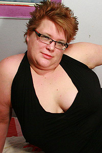 Chubby housewife with glasses on is having fun with herself