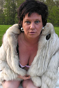 Dutch mature amateur nudist with big tits having no clothes under her fur coat